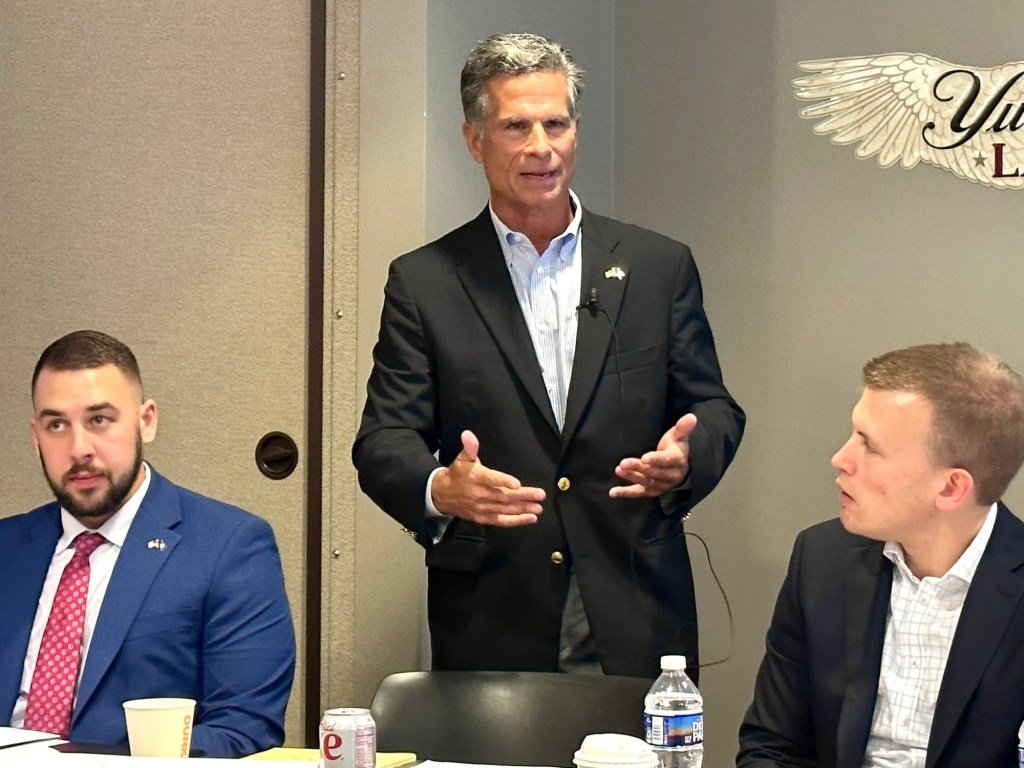 U.S. Congressman Dan Meuser, middle, speaks throughout Tuesday’s small enterprise roundtable dialogue close to Pottsville. His district director, Nathan Gerace, left, and Matt VanHyfte, proper, communications director for the U.S. Home Committee on Small Enterprise, additionally took half. (PHOTO BY MIKE URBAN)