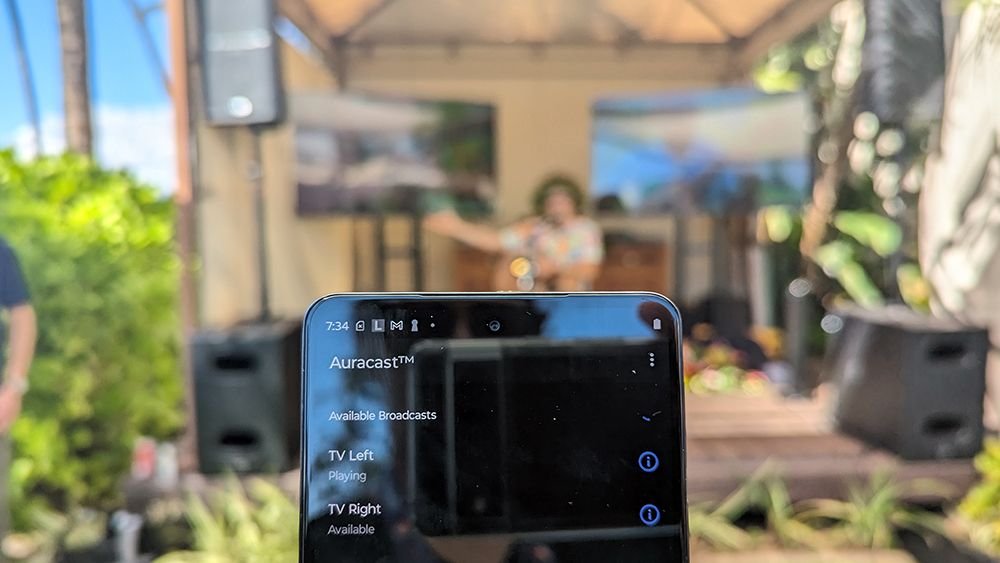 So I used to be given a appropriate cellphone and an unspecified pair of earbuds. The cellphone was working an Auracast software for demo functions, which merely listed the assorted ‘out there broadcasts’ to tune into, as you’ll be able to see within the photograph above. (I consider the thought – and splendid – is that Auracast shall be built-in into a tool’s OS person expertise, like Bluetooth and wi-fi, although maybe audio/service apps shall be Auracast-‘conscious’ too.) In entrance of me have been two Auracast-supporting Samsung TVs facet by facet, every enjoying totally different content material (of, when you should know, two totally different types of ukelele and guitar – the summit is held in Hawaii).