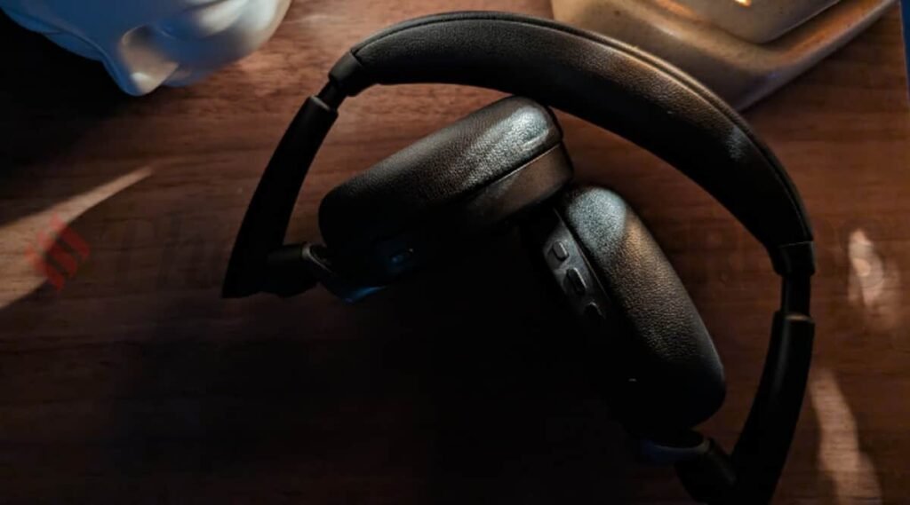 On the left ear cup, there’s a energy and pairing button in addition to a button that allows you to toggle between the hybrid noise cancellation and consciousness mode. The audio controls are all on the suitable, together with the microphone increase arm that may be pulled down. One other attention-grabbing facet is the purple LED lights on the aspect of the ear cups that present you’re busy and on a name and never precisely chilling out together with your workplace playlist.